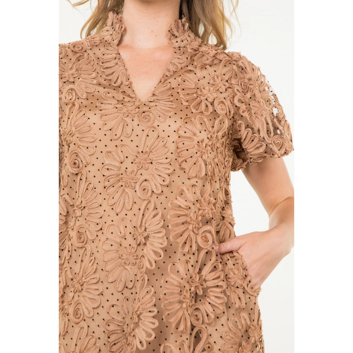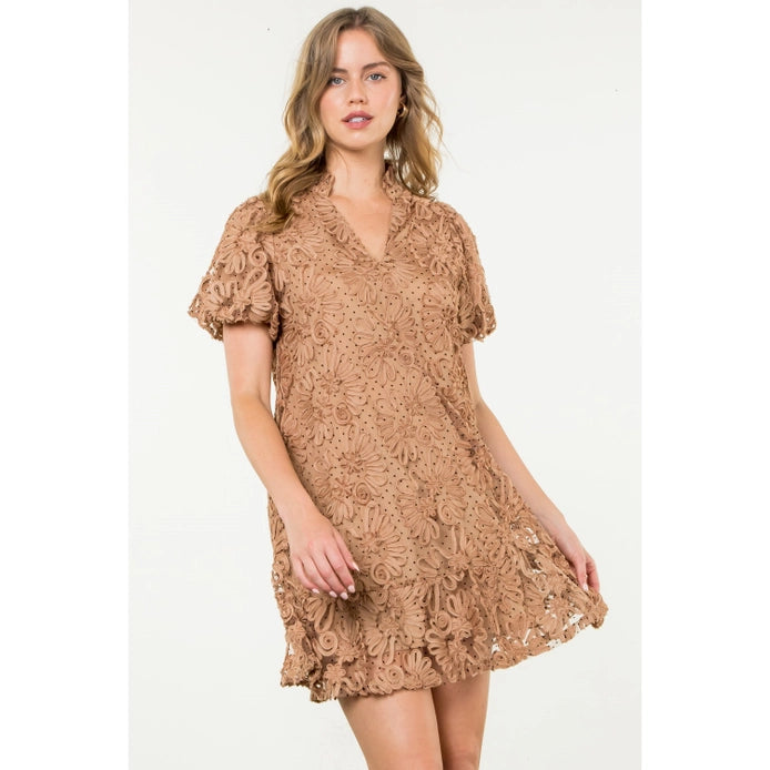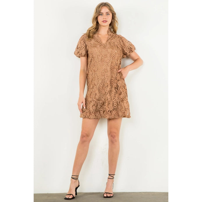 Detailed Mesh Puff Sleeve Dress .   Designed in USA