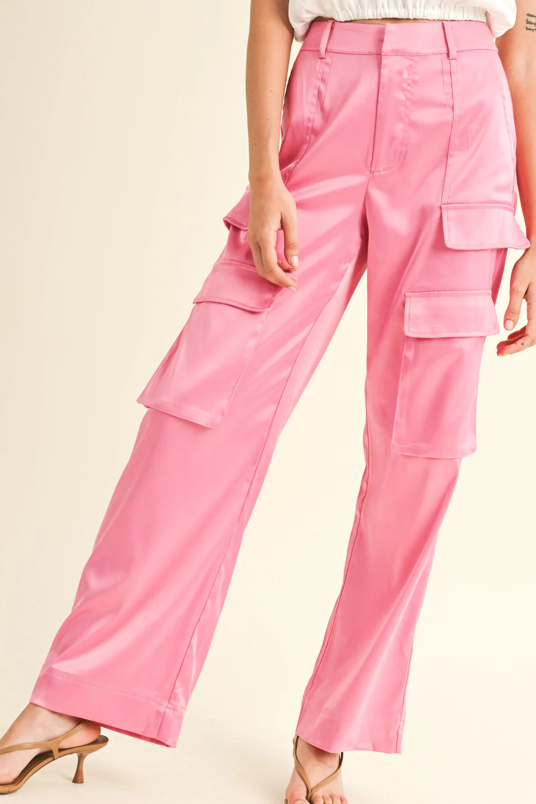 Step out in style with the Cassie Satin Cargo Pants. These cargo pants feature 3D flap pockets on both legs, side pockets, and back welt pockets, giving you the option to carry all your necessities in one go. Made in the smoothest, silkiest satin, these cargos not only look great but feel great.