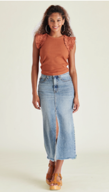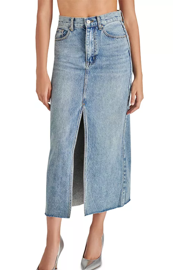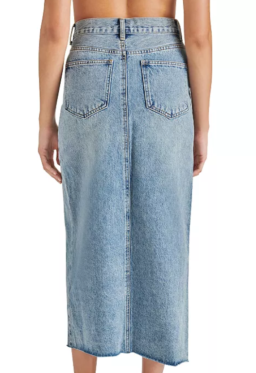 Experience effortless style with the AVANI denimskirt. Crafted from high-quality denim, this maxi skirt features a flattering front slit and a raw hem that adds a touch of elegance to your look.