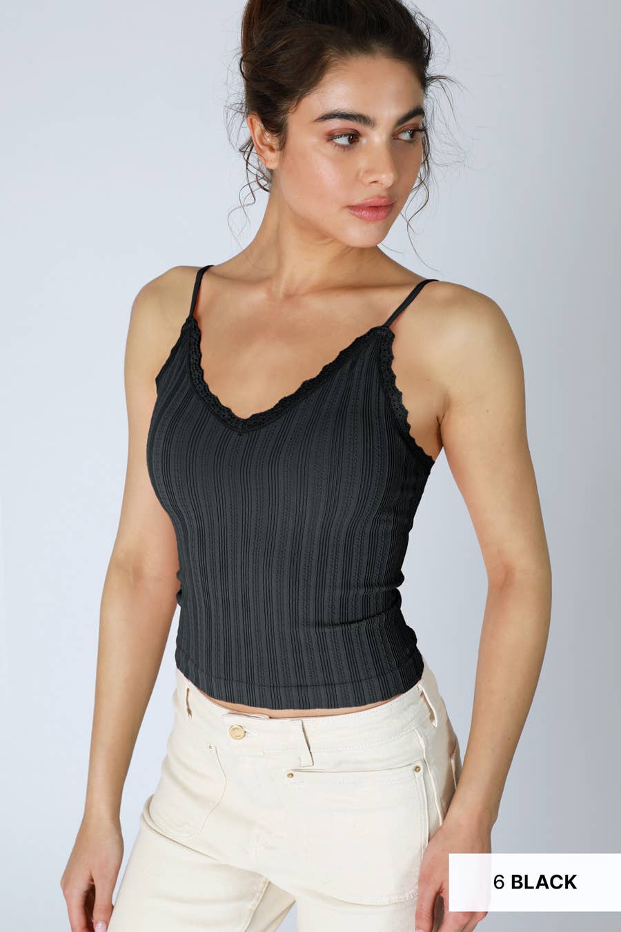 A sleek and comfortable addition to your wardrobe, this wide ribbed cami top features a scoop neckline with delicate lace trim on both the front and back. Its minimalist design with skinny straps is perfect for layering or wearing solo.