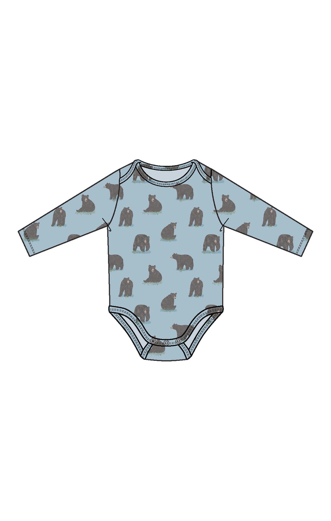 Bring a little wild into your baby’s wardrobe with this adorable black bear print bodysuit. Featuring a soothing blue background and playful bear illustrations, this cozy one-piece is made from buttery-soft bamboo viscose—perfect for snuggles, naps, and everyday adventures. Designed with lap shoulders for easy dressing and bottom snap closures for quick changes.