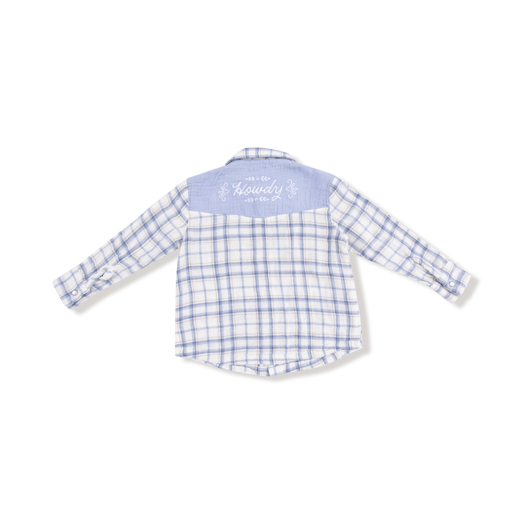 Y’all ready for some charm? This long sleeve Western shirt features a soft blue-and-cream plaid pattern with a sweet surprise—embroidered floral yokes and a bold “Howdy” stitched on the back. With pearl snap buttons, dual chest pockets, and a classic cowboy cut, it’s perfect for rodeo days, family photos, or just wrangling up some fun.