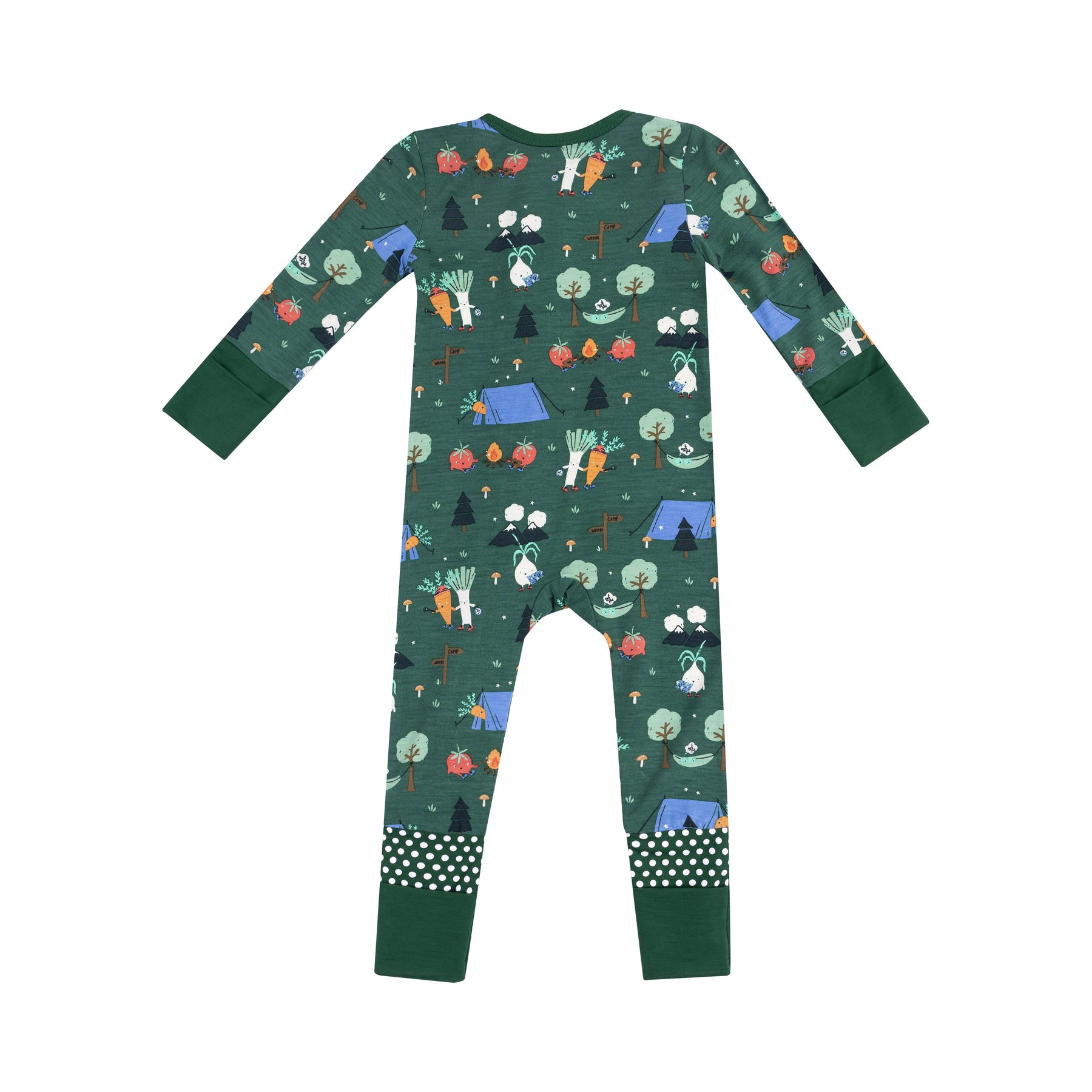 Get your little sprout ready for bedtime adventures in the Veggie Campout Romper. Featuring an adorable camping-themed veggie print on a deep forest green backdrop, this romper is made from ultra-soft bamboo fabric that keeps baby cozy while offering stretch and breathability. The two-way zipper makes late-night changes a breeze, while fold-over cuffs provide comfort and versatility.