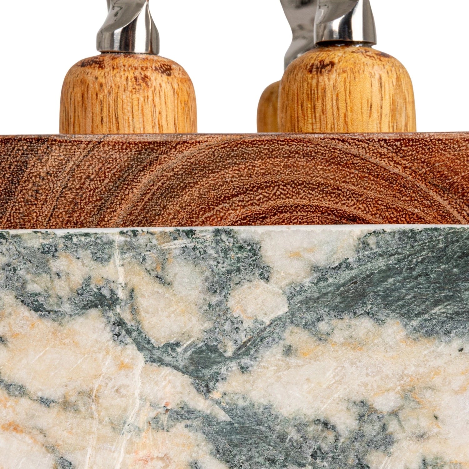 Serve your favorite cheeses in timeless style with this elegant stainless steel cheese server set. Featuring four uniquely shaped tools designed for slicing, spreading, and serving, each piece rests beautifully on a two-tone wood and marble stand for a refined presentation. The mix of materials—sleek metal, warm wood, and cool stone—adds a sophisticated touch to any charcuterie board or gathering.